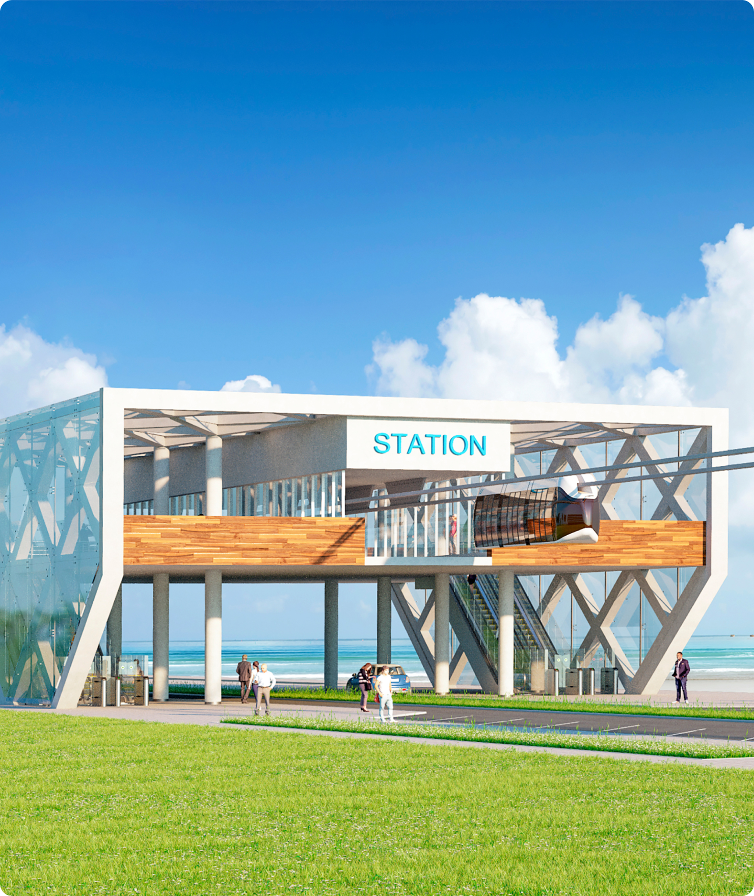 Modular principle allows to fit stations and terminals into the surrounding landscape naturally and, if necessary, expand infrastructure, including integrated cafes, shops, entertainment centres, ATMs, pharmacies, etc.